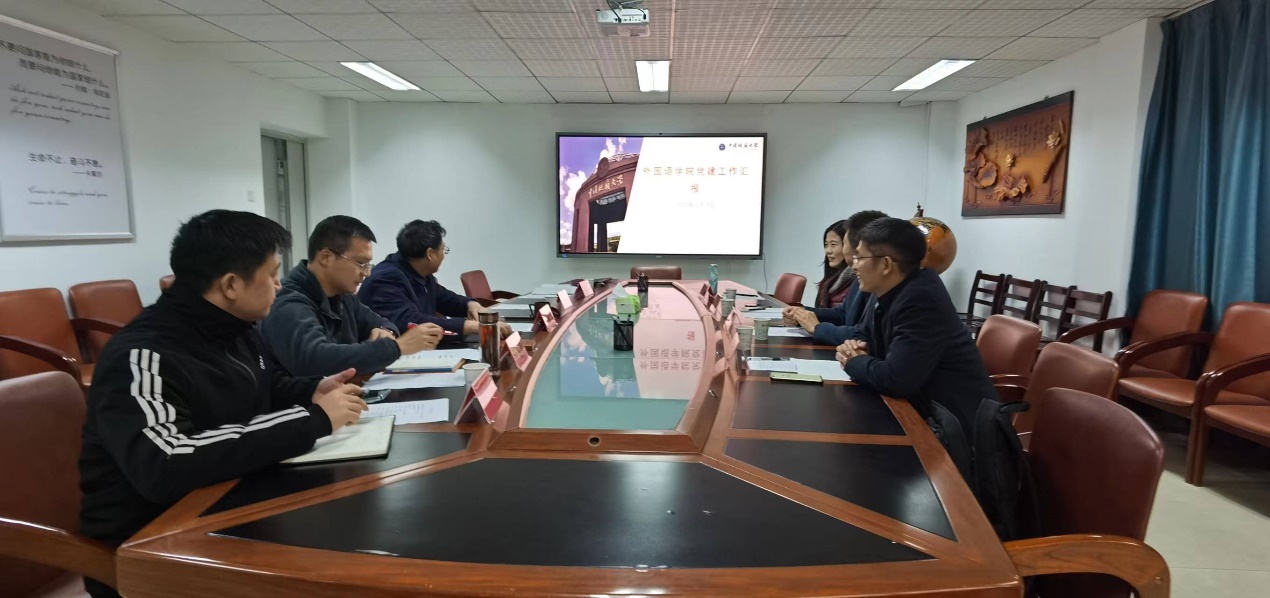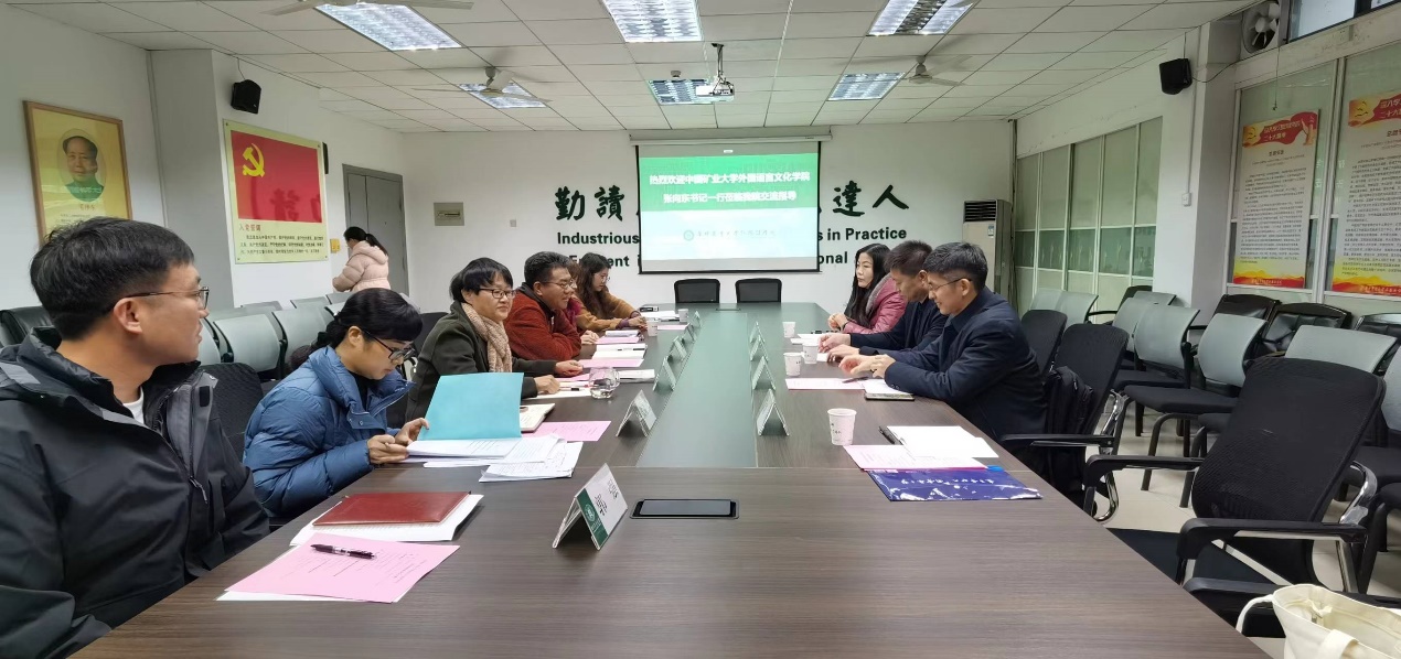 下午,调研人员一行与中国地质大学(武汉)外国语学院党委书记刘世勇、党委副书记余尚蔚等座谈交流。刘世勇书记详细介绍了学院党建工作整体情况,并对学院发挥语言优势,面向国际传播红色故事的“译术-信达-声”党建特色、“红专美创”学生工作特色以及“一带一路 我来带路”等品牌活动进行了详细介绍。党委副书记余尚蔚介绍了学生工作相关情况。双方人员还就基层党支部建设特色做法、样板党支部建设经验等进行深入交流。