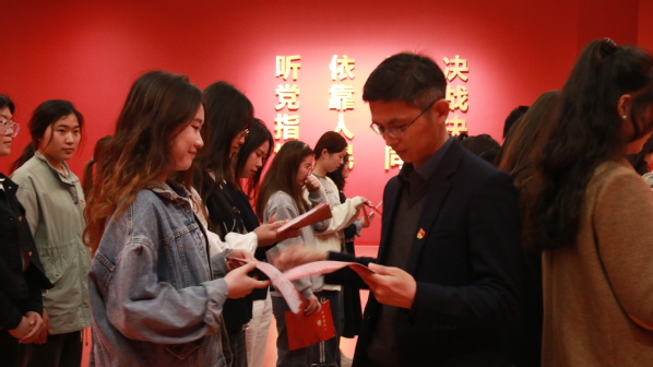 在纪念馆传承大厅举行了新党员入党宣誓、老党员重温入党誓词活动。仪式前,朱正中为新党员发放了《入党通知书》。