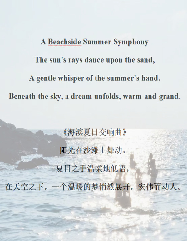 张晓颖同学的Twelves Years(《十二年》)与余海跃同学的A Beachiside Summer Symphony(《海滨夏日交响曲》)从不同的角度书写了梦想和奋斗。Twelves Years,写给青春岁月献给足球的汗水与拼搏,也承载着青春的热情与回忆,正值毕业季,不管是绿茵场,还是人生道,愿我们不留遗憾,永远奔跑。A Beachiside Summer Symphony,一个在夏天中温暖又宏伟的梦,是期待也是祝愿。诗中的文字充满了温情与感动,希望不管是离开矿大的毕业生还是即将来到矿大的新鲜血液都拥有美好的未来。
