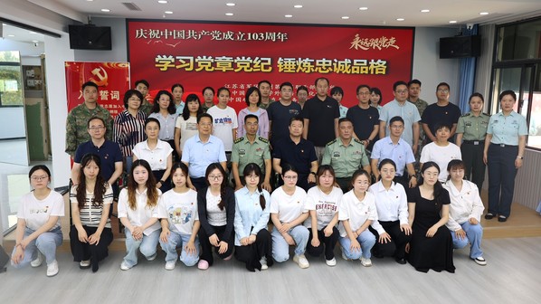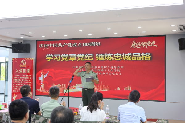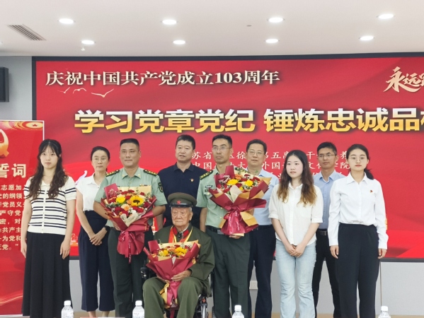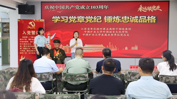 为迎接中国共产党成立103周年,推动党纪学习教育走深走实、入脑入心,6月28日上午,yl23411永利集团官网与校直属业务单位,联合江苏省军区徐州第五离职干部休养所共同举办“学习党章党纪、锤炼忠诚品格”“七一”主题党日活动。参加过抗美援朝战争、荣获朝鲜三级国旗勋章、荣立三等功二次的98岁的离休老干部孙金波,yl23411永利集团官网党委书记张向东、副书记朱正中及部分学生党员代表,校直属业务单位党总支书记方跃平、副书记尹良伟及部分教职工,江苏省军区徐州第五离职干部休养所所长李新胜、政委唐克伟及部分官兵参加活动。唐克伟主持活动。