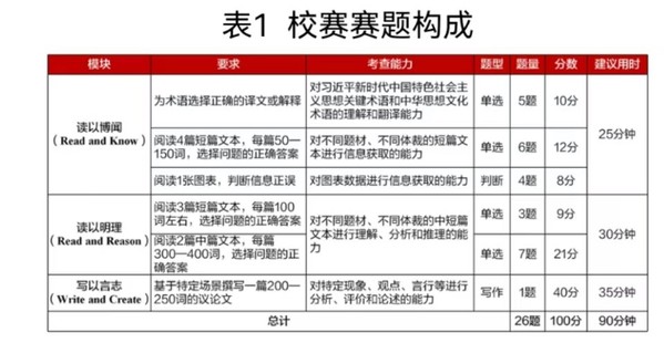 2024年“外研社·国才杯”“理解当代中国”全国大学生外语能力大赛英语组综合能力赛项整合原写作、阅读赛项,统一考查选手的英语综合能力。学校初赛旨在考查学生的英语阅读和写作能力,省复赛和全国决赛增加了对学生的英语演讲与翻译能力的考量。