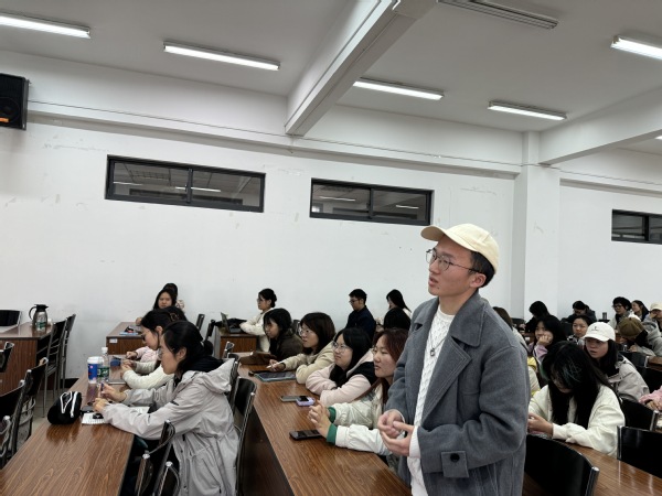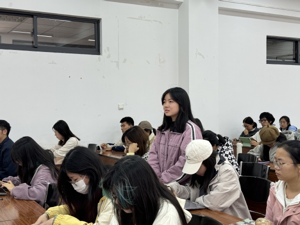 顾艳做分享交流。首先,她向同学们分享了自己的大学求学经历和校园生活。她希望同学们在大学里要做好目标规划,在风华正茂的年纪要敢想敢干,拼搏奋进。之后,她分享了自己作为学生和职场人的心得,向同学们讲解了学校和职场所需要提高的相关技能,希望同学们在大学期间学好语言的同时,培养自己综合能力,努力成为复合型人才。最后,顾艳与学生们进行了互动交流,回答学生们的各种疑惑和问题。