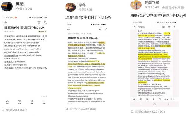 活动要求同学们结合当代中国社会的热点话题、重要事件,以及习近平总书记在二十大报告上的重要讲话内容,积累英语语料素材,学习如何用英语讲好中国故事。活动期间,同学们积极参与,按照要求上传学习材料,进行每日线上打卡。