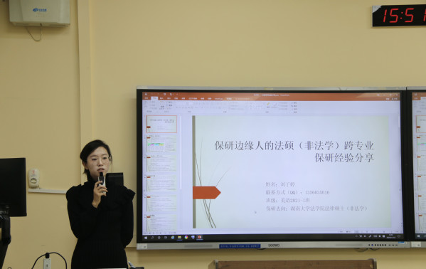 唐许锦怡以其成功保研至浙江大学翻译专业的经历为例,鼓励排名靠前的学生充分利用自身优势,把握机遇。马垚腾同学以自己保研至北外的翻译学经历为例,分享了保研准备过程的具体步骤,并告诉学弟学妹们对待保研问题要有一个好的心态。杨依琳分享了自己跨专业保研至北京师范大学国际汉语教育专业的经历,向大家分享了自己对于跨保利弊的分析,让大家对跨专业保研有了更深的理解。刘子婷同学针对保研边缘化现象,分享了她跨专业保研至法硕的心路历程以及备考策略,鼓励同学们在面对选择时不要迷茫,要坚定信念,勇往直前。邹嘉怡同学着重介绍了夏令营申请的策略,她鼓励大家采取“广撒网、大胆投”的方法,以增加成功的机会。周怡彤和王家悦两位同学分别分享了关于我校马克思主义学院的硕博连读项目和校团委组织的研究生支教团相关政策,为同学们提供了实用的参考。