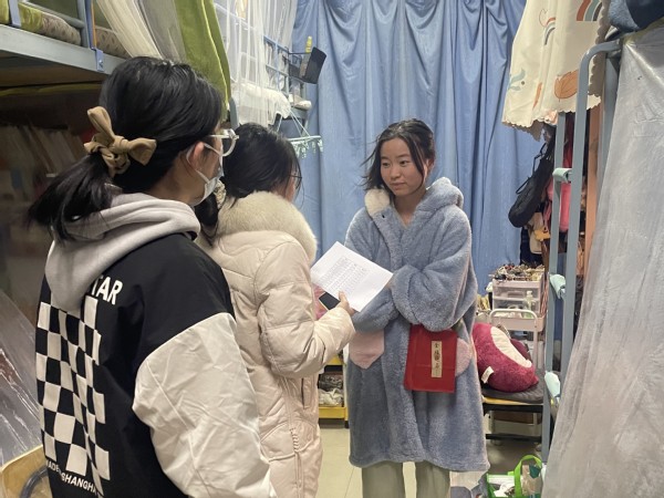 辅导员汪萍关心同学们目前的生活情况,与大家一起讨论了考研准备过程中所面临的问题,希望同学们调整心态、规律作息,轻松备考。之后,汪萍为考研学子发放了精心准备的慰问品。