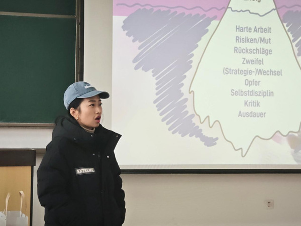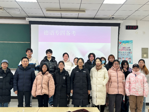 常波从听力、听写、阅读、语法与词汇和写作五个板块进行讲解,针对、考试、难点进行技巧点拨,分享相关学习方法。匡洁和骆佩就下学期德语的学习课程进行具体安排,建议学生利用寒假时间练习专四考试内容,并结合自身学习经历,鼓励学生积极规划未来发展。