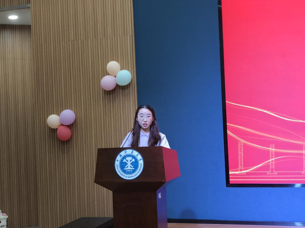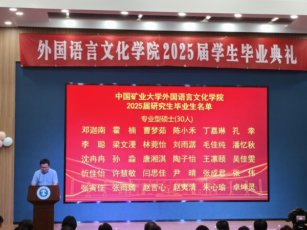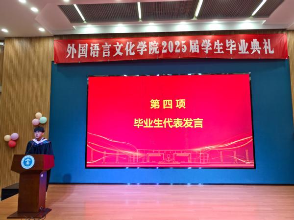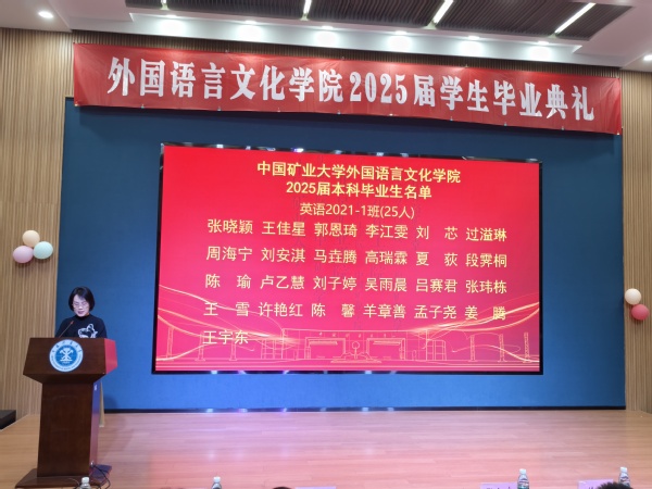 在代表发言环节,教师代表刘会民鼓励毕业生们以语言为舟,文化为帆,用卓越的沟通能力架设中外交流的桥梁,自信驶向广阔的世界舞台。校友代表王善翌分享了他的职场经历,强调专业跨界、团队协作与终身学习的重要性,寄语学弟学妹永葆活力、敢于创新、勇于超越。宿舍管理员李贵华殷切叮嘱学子们离校独立生活学会照顾自己,珍惜同窗情谊继续保持联系,不忘母校培养常怀感恩之心。研究生毕业生郭思婕、本科生毕业生英语专业唐许锦怡、德语专业张子杨,衷心感谢母校培养与恩师教诲,难忘在矿大埋头科研、勤学奋进的点点滴滴,矿大赋予的知识与信念,积蓄为迎接未来挑战的勇气。