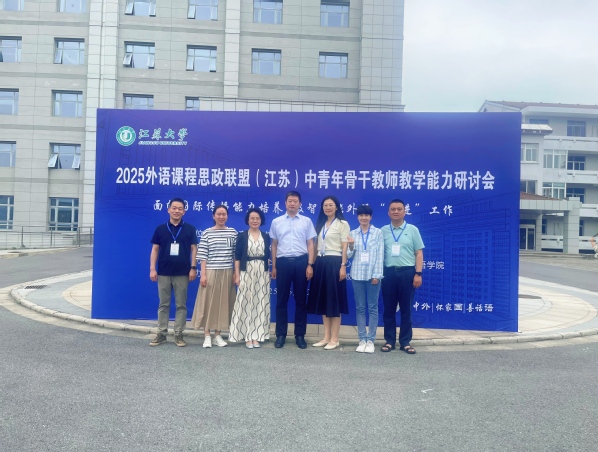 2025年6月12日至13日,学院党委书记张向东、副院长刘婷婷、大学外语一部主任董永义及3名骨干教师,赴江苏大学参加“外语课程思政联盟(江苏)中青年骨干教师教学能力研讨会”,与省内七所高校共同探讨高校党建联盟背景下外语课程思政的创新实践,并举行外语课程思政联盟(江苏)LOGO发布仪式。