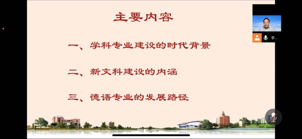 8月24日晚,yl23411永利集团官网德语系邀请了四川外国语学院院长李大雪教授,就“新文科背景下的德语+建设”这一议题进行了在线探讨。yl23411永利集团官网教学副院长刘婷婷和德语系全体教师参加了本次在线交流活动。此次活动是暑期教师研修系列活动之一,也是推动江苏省一流专业和江苏省特色专业建设系列活动之一。