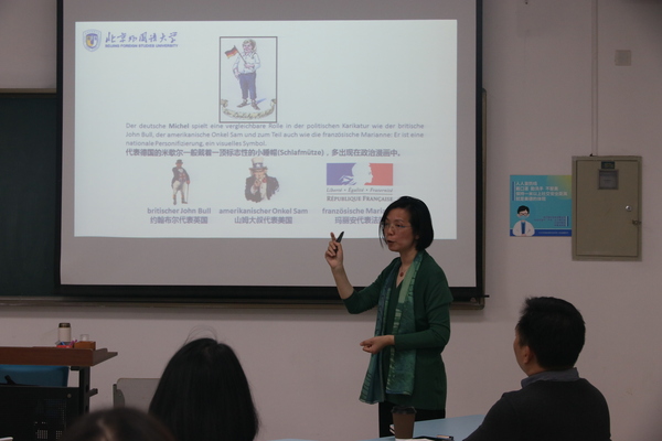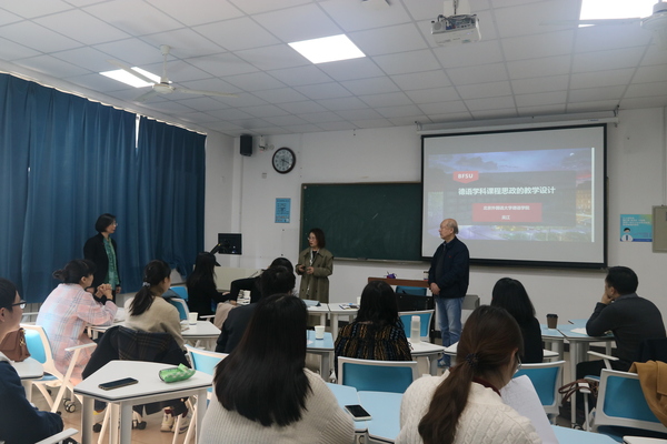 本次活动别出心裁地采用了翻转课堂教学模式,吴江教授和德语系教师们共上一堂课,不过教师们扮演起了学生角色,从学生的角度去感受课程思政,体验了一次沉浸式教学。首先,吴江教授从教学设计的原则、思路和实施三个方面入手,提纲挈领地介绍了外语专业必须以兼容并蓄的心态,以问题整合学科,服务国家和社会。外语人应该以“不愤不启,不悱不发”作为教学标准,打破传统的学科理念,在新文科战略的宏大视野下,重新审视自我发展。随后,又以她的思政获奖课程《德国外交》为例,抽丝剥茧,介绍了如何架构这一门课。