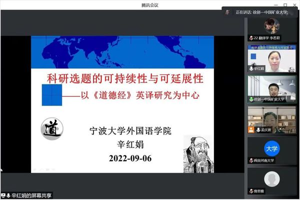 9月6日晚8点,yl23411永利集团官网“博雅”学术论坛第十一期通过腾讯会议成功举行。该论坛由国际汉学与比较文学研究中心主办,邀请宁波大学外国语学院的辛红娟教授做了题为“科研选题的可持续性与可延展性——以《道德经》英译研究为中心”的讲座。本次论坛由徐剑院长主持,祖大庆副院长以及学院部分师生190余人共同参与。