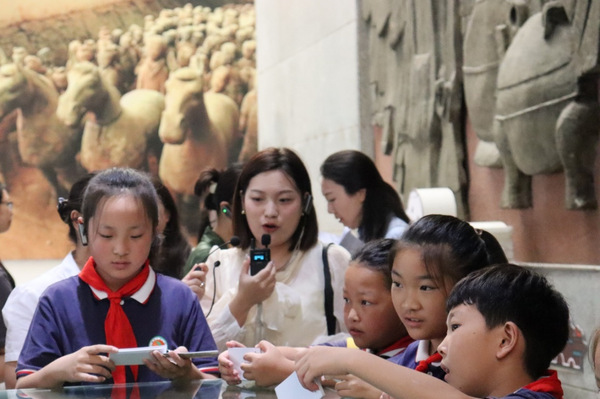 活动伊始,志愿者们为每个孩子提供了单词手卡,帮助孩子们在游览中记忆,在记忆中感受。在汉兵马俑博物馆中,讲解员带大家领略汉朝的军事风采,兵士俑们姿态各异、栩栩如生,正威严列阵、似蓄势待发。在活动体验区,小学生们体验了投壶、射箭的装备,让孩子们体验了一把“君子之艺”。临湖廊榭蔓回曲折,一面临景另一面置汉画石,石画线条刀刻斧凿,深深浅浅,明暗交织,诉说只有时光能听懂的故事。在汉文化大讲堂,汉学老师向大家普及了汉代礼仪知识,孩子们向老师行天揖礼,老师回土揖礼,一来一往,牵连起情谊,交织成传承的信念。随后,志愿者代表通过“词根/词缀+联想”记忆法,向孩子们讲解了汉文化相关英语词汇,引导孩子们将单词放入一定的语言环境,结合句意,高效记忆英语词汇。在参观过程中,志愿者们也同时采集景区不规范的标识翻译,以期规范徐州汉文化景区的标识翻译。
